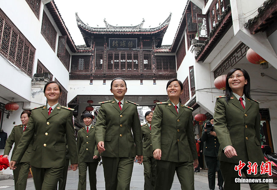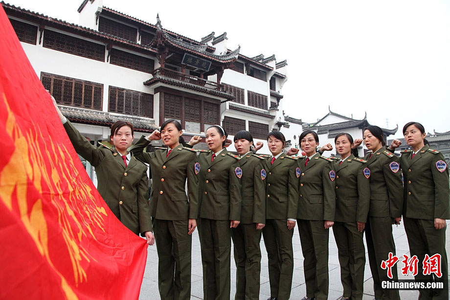 11月1日,安徽黃山歙縣古徽州女子民兵連的女民兵在訓練。歙縣古徽州女子民兵連是安徽省唯一一支女子民兵連,由100人組成,百分之百的大專以上學歷、百分之百的黨團員。去年3月8日成立以來,為歙縣古城的社會穩定和各種搶險做出了卓有貢獻。瞧,她們的英姿多瀟灑。吳建平 攝