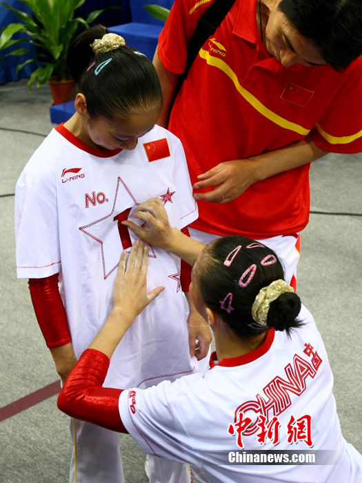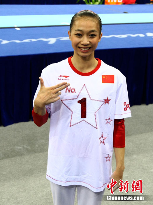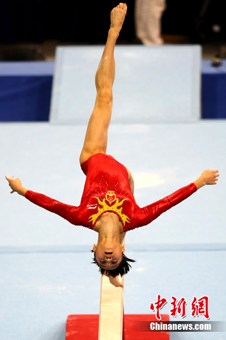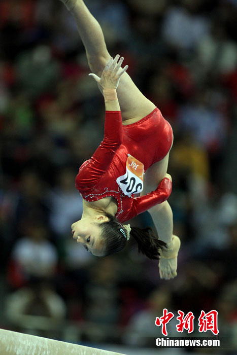 11月14日,在廣州亞運會女子體操團體決賽中,中國隊擊敗日本隊奪冠,實現了亞運會的“十連冠”。中新社記者 富田 攝