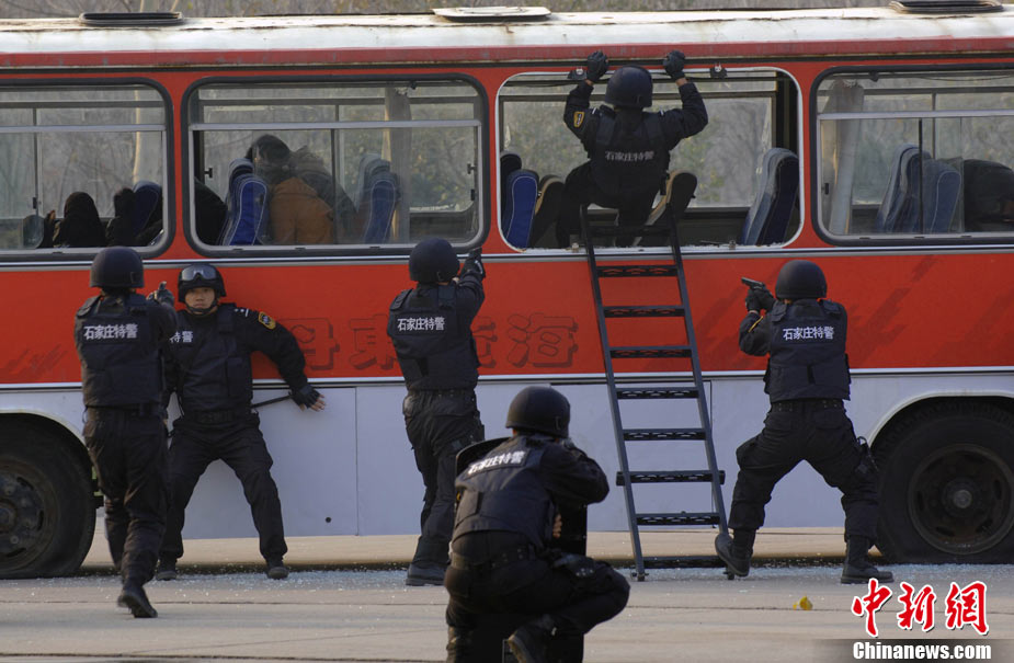 11月16日,河北石家莊特警、治安警、刑警、武警、交警、消防等多警種聯(lián)動(dòng),舉行代號(hào)為“紅箭突擊——2010”大型反恐處突應(yīng)急拉動(dòng)演練。據(jù)指揮部有關(guān)負(fù)責(zé)人介紹,此次演練從實(shí)戰(zhàn)出發(fā),主要分為參演隊(duì)伍分列式和處突實(shí)兵演練,以檢驗(yàn)重大案(事)件應(yīng)急處突力量的協(xié)同配合和處置能力。圖為特警“解救”客車(chē)上的游人。中新社發(fā) 劉志敏 攝