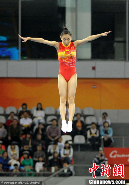 11月21日上午,廣州亞運會蹦床個人資格賽在亞運城體育館上演,中國女子選手何雯娜、黃珊汕;男子選手選手董棟、涂瀟全部順利晉級決賽。圖為何雯娜亮相亞運城體育館。中新網記者 金碩 攝