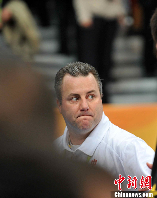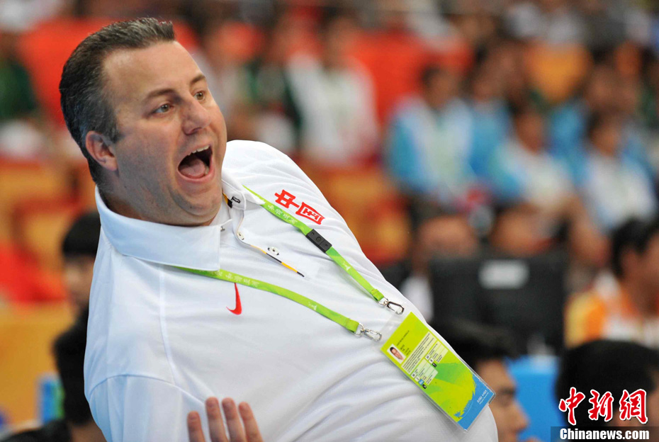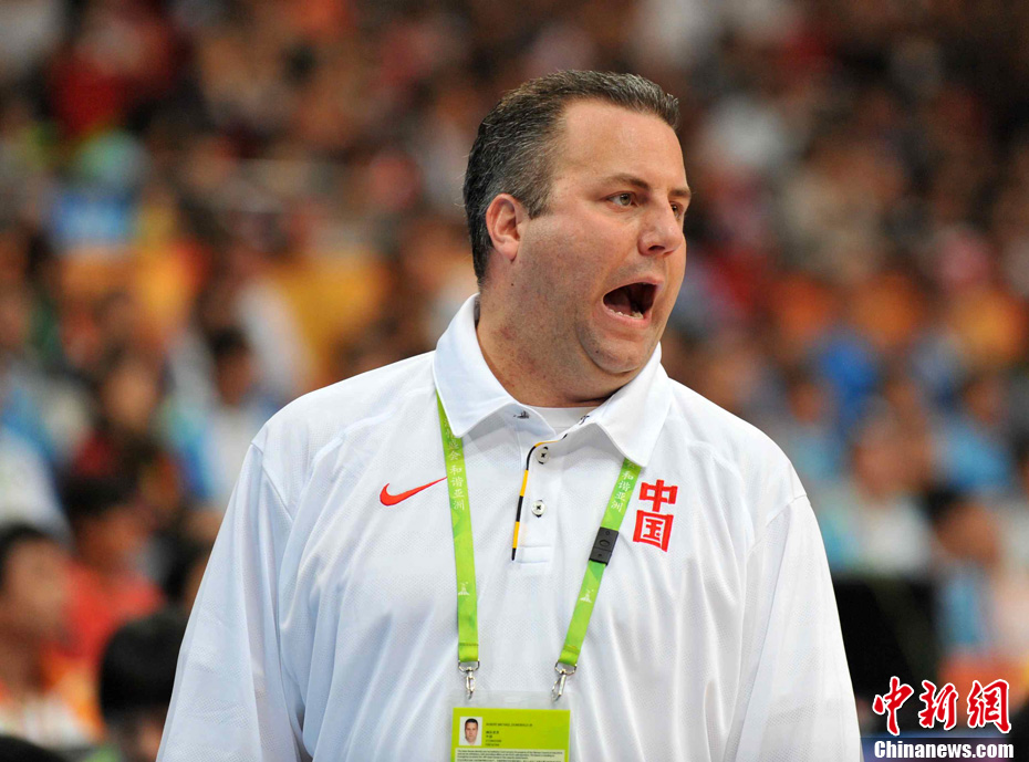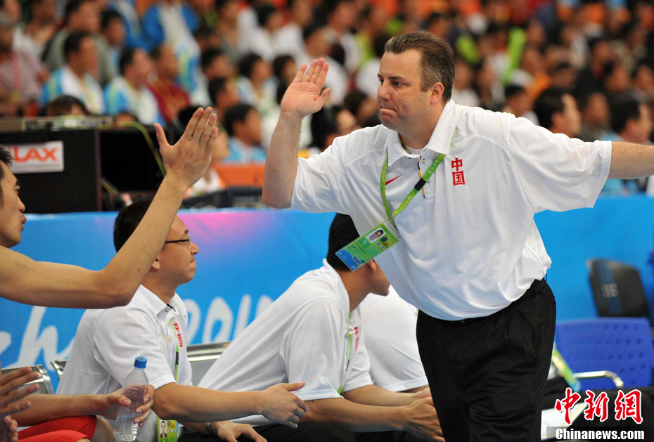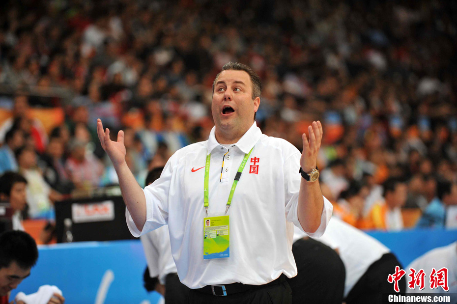 11月21日晚,中國男籃以76:66戰勝韓國男籃,比賽中主帥鄧華德在場邊激情執教。中新社記者 柯小軍 攝