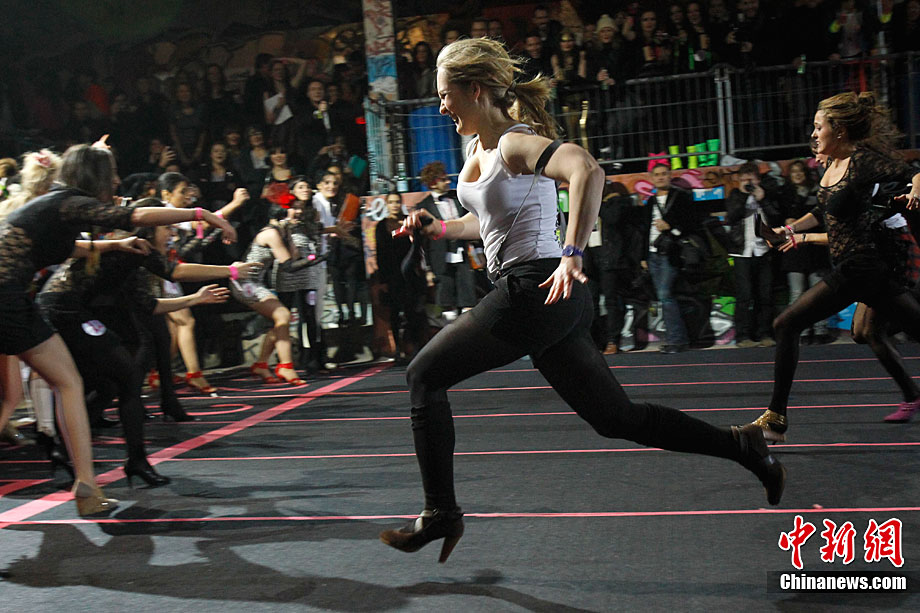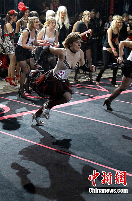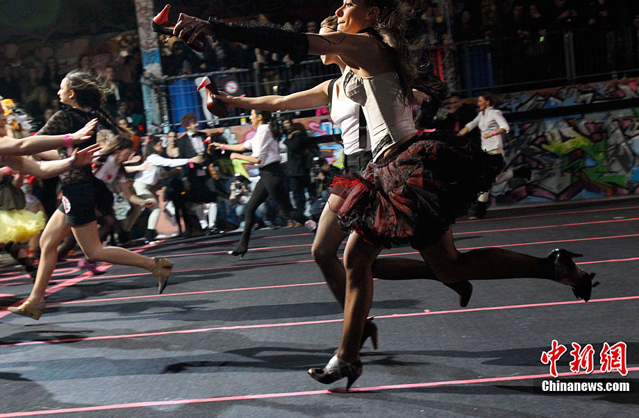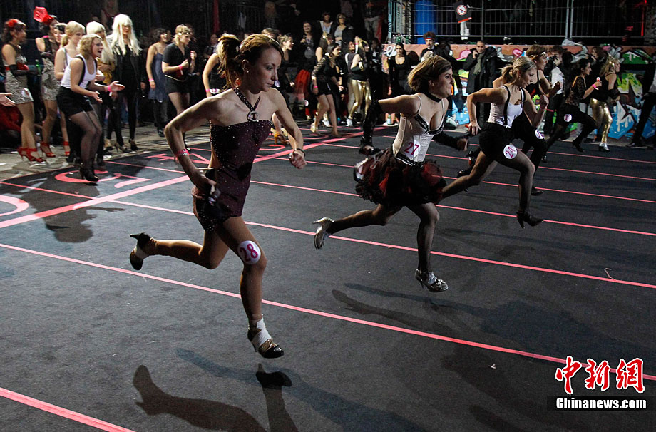 近日,第三屆Sarenza高跟鞋短跑比賽在法國(guó)巴黎舉行。來(lái)自法國(guó)和英國(guó)的選手參加了3×60米接力比賽。據(jù)悉,要想?yún)⒓舆@項(xiàng)趣味比賽,參賽者所穿的高跟鞋不得低于8厘米。