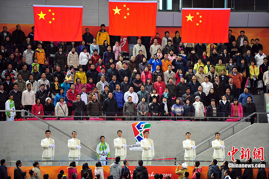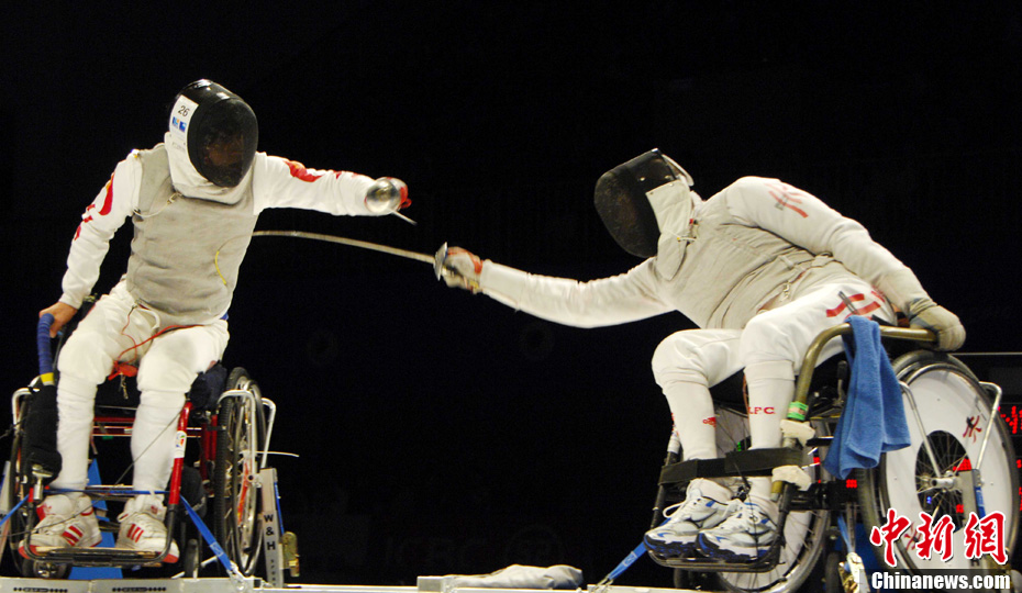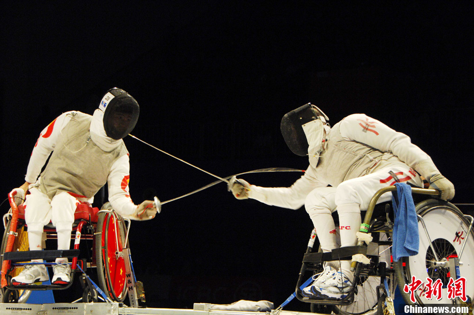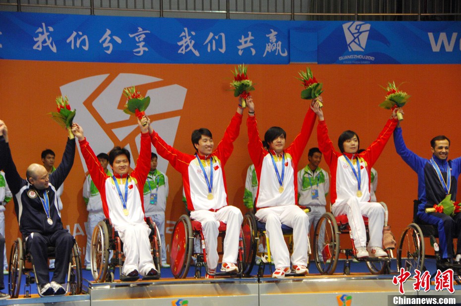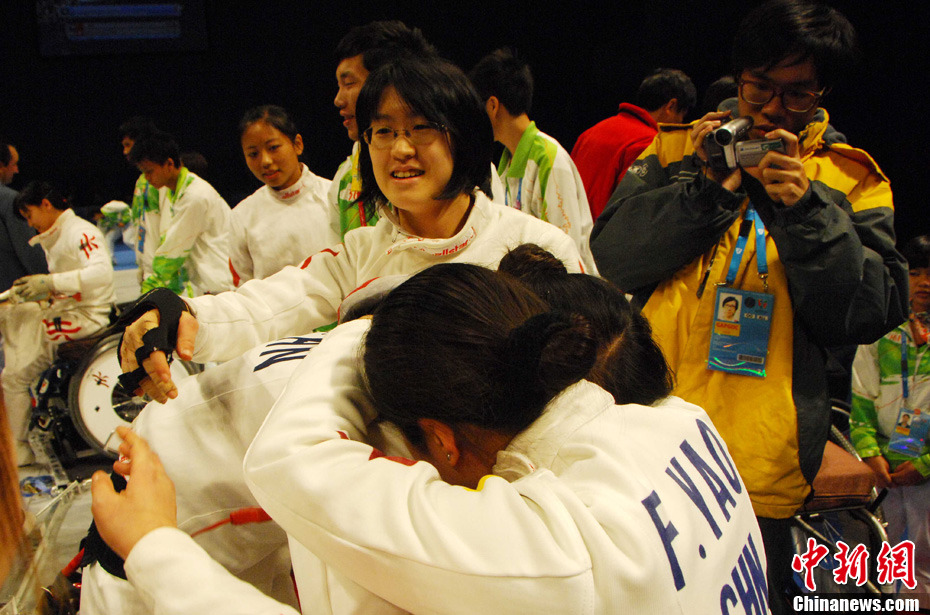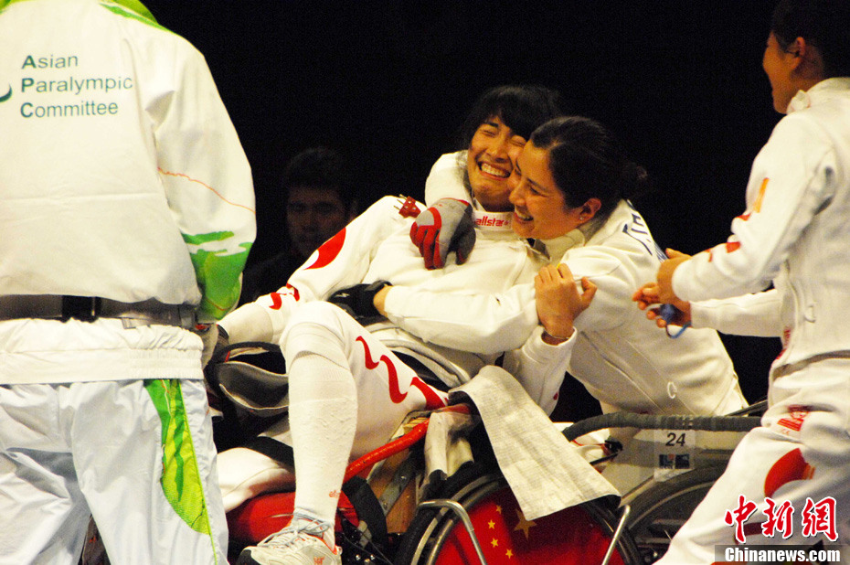 16日,在廣州亞殘運會輪椅擊劍賽場上,中國運動員勇奪輪椅擊劍女子團體重劍冠軍。圖為奪冠后隊員們高興地擁抱慶賀。中新社記者 陳文 攝