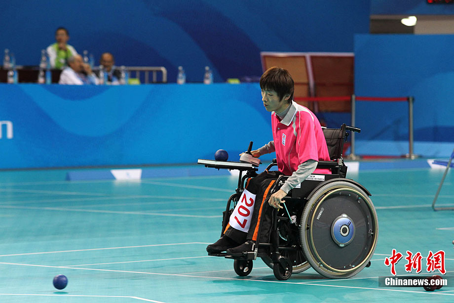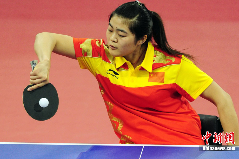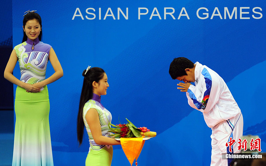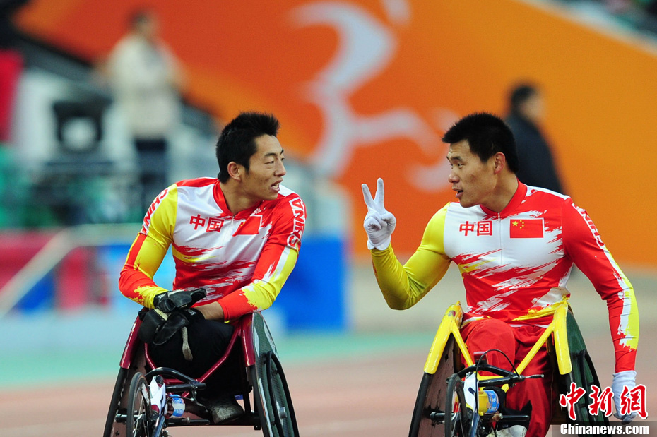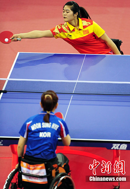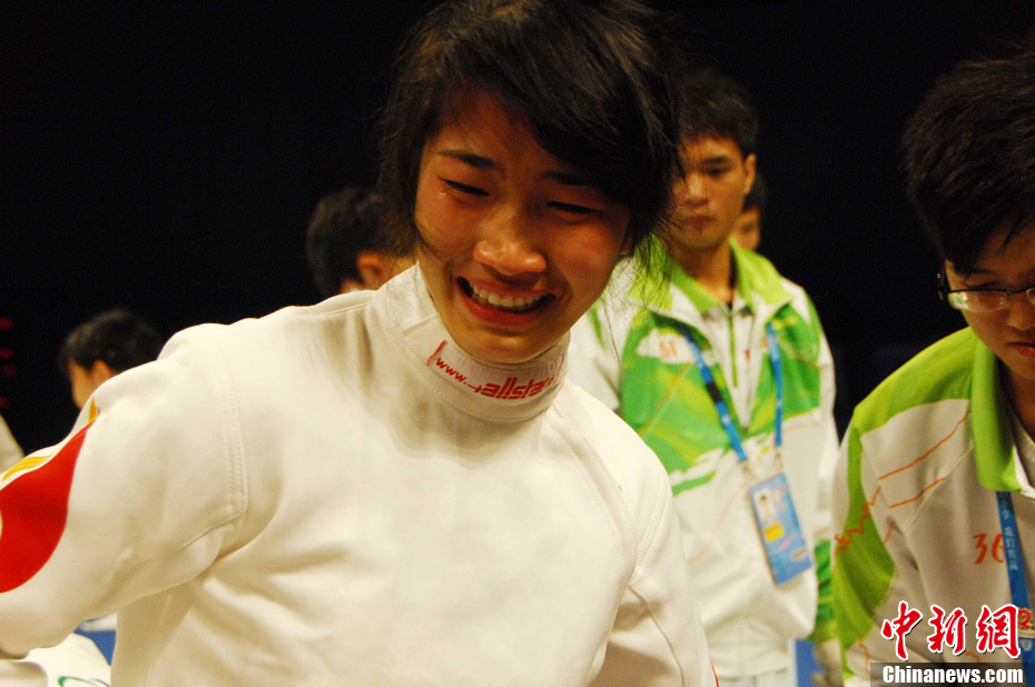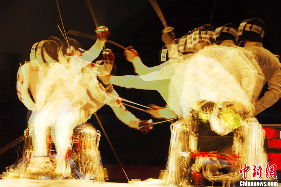 16日,在廣州亞殘運會輪椅擊劍賽場上,中國運動員勇奪輪椅擊劍女子團體重劍冠軍。圖為奪冠后隊員們高興地擁抱慶賀。中新社記者 陳文 攝