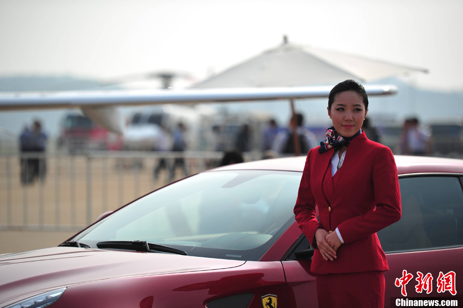 11月14日,第九屆中國國際航空航天博覽會進入第二天專業觀眾日,部分參展商在參戰飛機前安排了靚麗搶眼的“飛機模特”。中新社發 柯小軍 攝