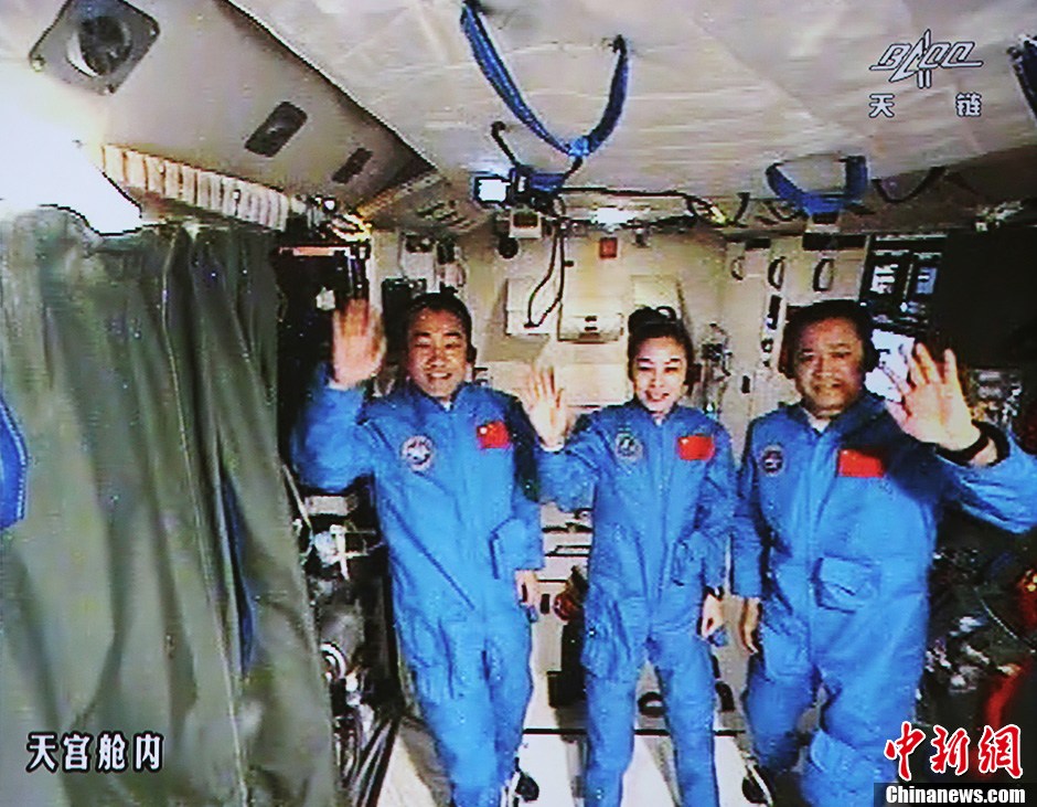 6月20日10時(shí)許,神舟十號(hào)航天員在天宮一號(hào)開(kāi)展基礎(chǔ)物理實(shí)驗(yàn),為青少年進(jìn)行中國(guó)首次太空授課。圖為神舟十號(hào)航天員授課前與大家招手致意。中新社發(fā) 秦憲安 攝
