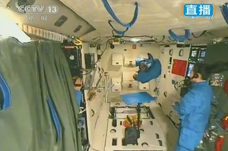 6月20日上午10時許,神舟十號航天員進行中國首次太空授課,女航天員王亞平擔任主講,成為中國首位“太空教師”。(視頻截圖)