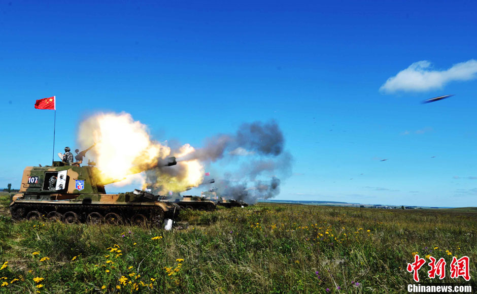 8月12日12時(北京時間下午2時),“和平使命-2013”中俄聯合反恐軍事演習,在俄羅斯切巴爾庫爾合同訓練場進行了實兵實彈協同訓練,中俄雙方出動了所有參演兵力,對聯合封控、分區清剿、火力突擊等內容進行了訓練,時間大約50多分鐘。圖為中方炮火實施遠程火力攔阻。中新社發 譚長俊 攝