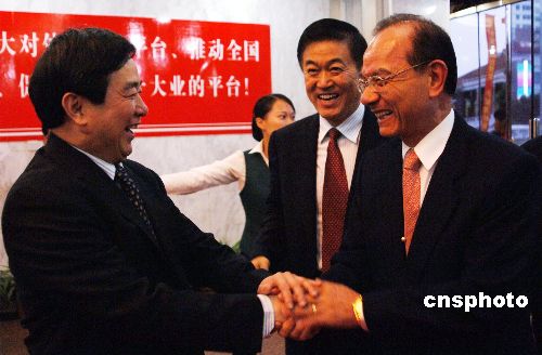 十一月十七日,福建省委常委、常務副省長張昌平(中)、漳州市市長李建國(左)在漳州與中國國民黨副主席林豐正(右)交談甚歡。第九屆海峽兩岸花卉博覽會將于十八日在福建漳州隆重開幕,屆時,島內外五百多名臺商將出席盛會。中新社發 王東明 攝
