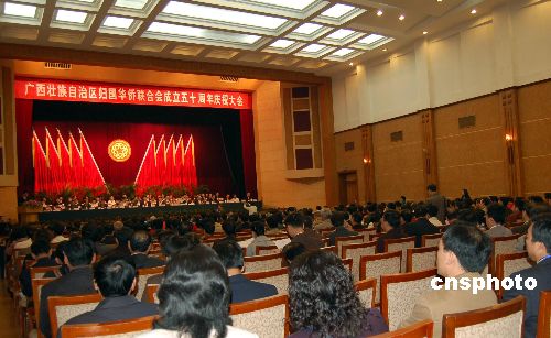 十一月二十八日,廣西壯族自治區(qū)歸國(guó)華僑聯(lián)合會(huì)成立五十周年慶祝大會(huì)在南寧舉行。東盟各國(guó)、美國(guó)和港澳等近二十個(gè)國(guó)家和地區(qū)的華人華僑代表和廣西各界人士共四百人出席大會(huì),中國(guó)僑聯(lián)副主席李祖沛在會(huì)上講話(huà),中共廣西區(qū)委員會(huì)書(shū)記劉奇葆發(fā)信祝賀。中新社發(fā) 劉萬(wàn)強(qiáng) 攝