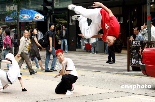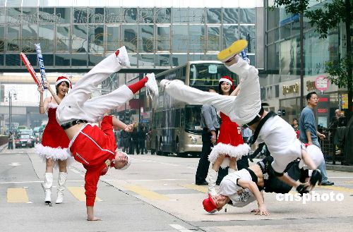 12月18日,香港B-Boys男子跳舞組合在海港城街頭大跳hip hop,靚麗圣誕女郎在場打氣,宣傳倒數迎接圣誕節活動。香港海港城將在24日晚舉辦盛大的街頭派對讓市民、游客狂歡倒數迎接圣誕節。中新社發 洪少葵 攝