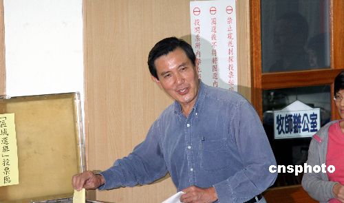 一月十二日是臺灣第七屆“立委”選舉日,當天下午,中國國民黨臺灣二00八年“大選”參選人馬英九前往投票場所投票。中新社發 孫自法 攝