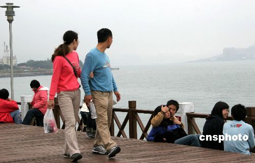 一月二十一日,一對(duì)夫婦從臺(tái)北淡水情人橋上走過(guò),不約而同將視線轉(zhuǎn)向橋邊甜蜜相會(huì)的一對(duì)對(duì)情侶。淡水情人橋位于臺(tái)北淡水河入海口的漁人碼頭,是觀海、休閑和情侶約會(huì)的好去處。中新社發(fā) 孫自法 攝