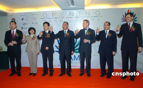 一月二十四日,澳門(mén)英國(guó)商會(huì)辦事處在中土大廈正式啟用,澳門(mén)特首何厚鏵等嘉賓親臨舉杯祝賀。澳門(mén)英國(guó)商會(huì)辦事處將擔(dān)任英澳兩地政府和商界之間的橋梁,為兩地造就商機(jī)、聯(lián)系及交流機(jī)會(huì)。中新社發(fā) 史利 攝