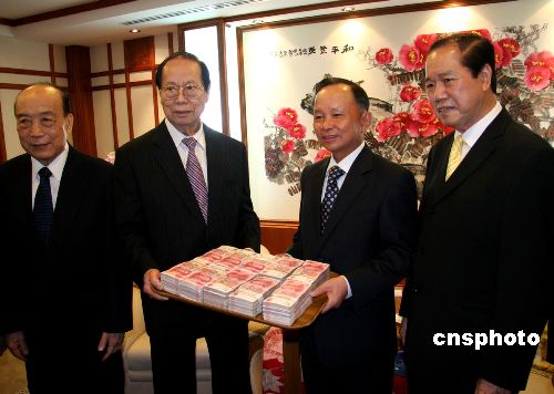 二月四日,曼谷,泰國中華總商會向中國雪災災區(qū)人民捐款現(xiàn)金五十萬元人民幣。中國部分地區(qū)近來遭到嚴重雪災的消息牽動無數(shù)泰國華僑華人的心,泰國多個華人社團、公司及個人,四日紛紛前往中國駐泰國大使館向災區(qū)捐款救災。泰國正大集團、中華總商會、九屬會館、泰國進出口商會、泰國各姓氏宗親總會聯(lián)合會、泰國報德善堂等華人公司和社團的領導人,向中國駐泰大使張九桓(右二)轉交總計二百六十萬元人民幣和二百萬泰銖捐款。中新社發(fā) 顧時宏 攝