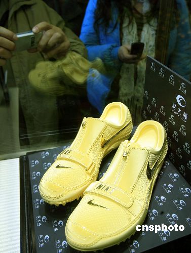 農(nóng)歷新年喜慶時(shí)節(jié),香港沙田馬場舉辦黃金藝術(shù)珍品展覽,展出二十多件設(shè)計(jì)獨(dú)特、手工精致的黃金藝術(shù)珍品。圖中以有世界飛人之稱劉翔破世界記錄時(shí),以其所穿跑鞋實(shí)物原大打造的黃金跑鞋,引來眾多觀眾興趣。這雙黃金跑鞋長二十六厘米,黃金重約十六兩,價(jià)值超過二十三萬多港元。中新社發(fā) 王麗南 攝