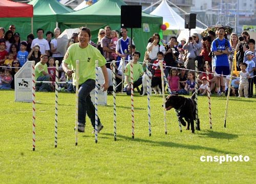 香港跑馬地游樂場周末舉辦多項體育活動,讓市民在運動中感受奧運精神。圖為香港狗協會組織的狗接力賽-狗穿桿。 中新社發 王麗南 攝