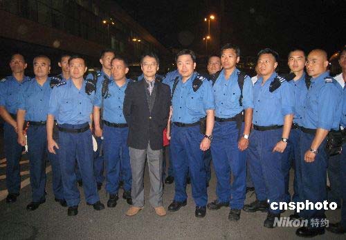 五月十五日凌晨,香港特區政府派出的二十人搜救隊伍,抵達四川地震災區協助搜救工作。搜救隊成員包括消防處特別救援隊十五名消防員及三名救護員,以及衛生署一名醫生及護士。圖為香港特別行政區政府駐成都經濟貿易辦事處主任陸仿真(中)與搜救隊員合照。中新社發 中新社/政府新聞處 攝