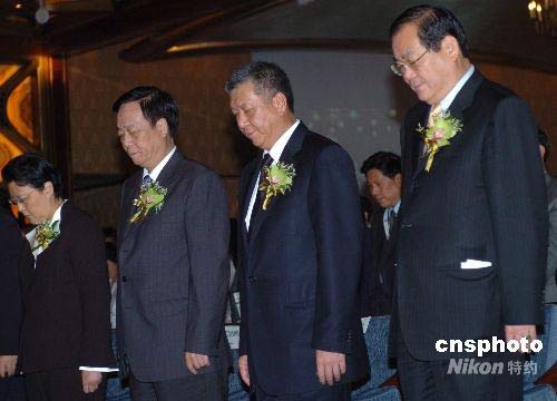 五月十九日,澳門(mén)特首何厚鏵(右二)在美高梅金殿默哀,悼念四川地震遇難同胞。當(dāng)日至二十一日為全國(guó)哀悼日。中新社發(fā) 史利 攝