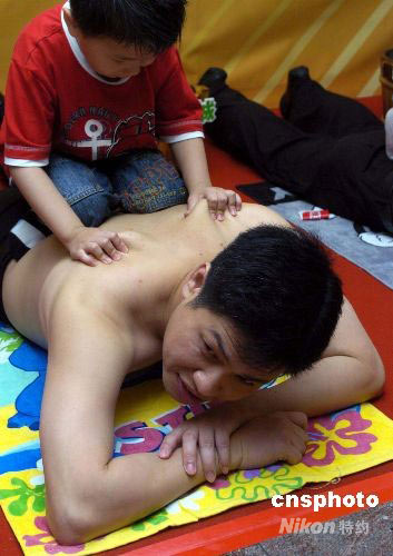 六月五日,香港一商場舉行“感恩父親節”活動,邀請幾名小朋友為父親擦背按摩,預祝甜蜜父親節的來臨。中新社發 譚達明 攝