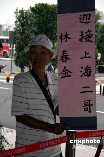 兩岸周末包機七月四日啟程,臺灣社會各界關注。二十歲來到臺灣的老伯林振鳳一大早從臺南趕到臺北松山機場,接搭乘兩岸周末包機八十四歲的二哥林春金。這將是林振鳳老人自十六年前臺灣當局開放到大陸探親后,他再次與兄弟相見。中新社發 徐長安 攝