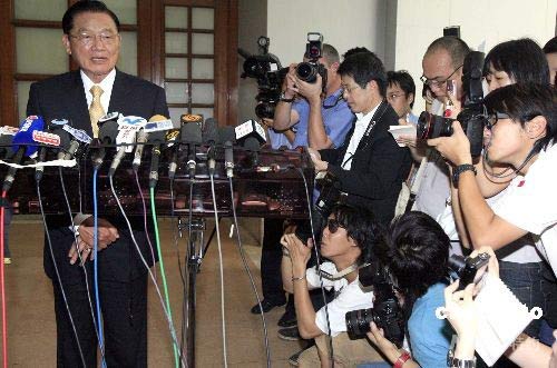 七月十八日,香港特區(qū)行政長官曾蔭權(quán)在禮賓府會(huì)見臺(tái)灣海基會(huì)董事長江丙坤。圖為會(huì)面后江丙坤接受媒體的采訪。中新社發(fā) 張勤 攝