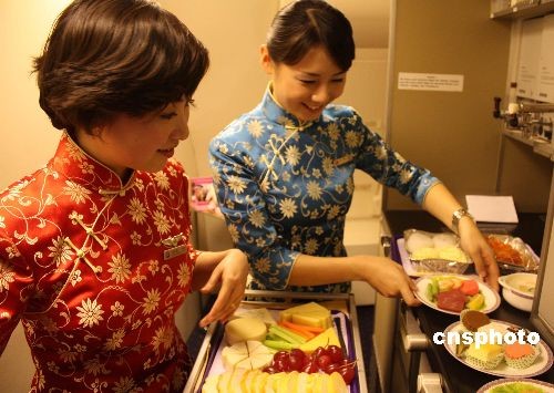 圖為首航乘務(wù)員正在客艙中展示餐食的服務(wù)程序。