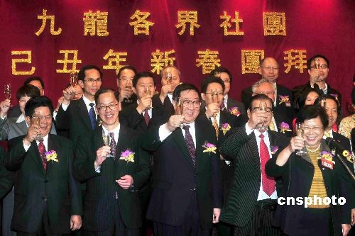 二月六日,九龍地區事務聯會聯席會議及九龍社團聯會等在香港一酒店舉行新春酒會,各界嘉賓濟濟一堂,場面熱鬧。中聯辦主任高祀仁(前中)及香港特區民政事務局局長曾德成(前左二)等帶領眾嘉賓祝酒。中新社發 譚達明 攝