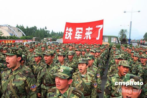 5月16日,有“鐵軍”之稱的濟南軍區某集團軍趕到四川都江堰地震災區參加救援。中新社發 張雷 攝
