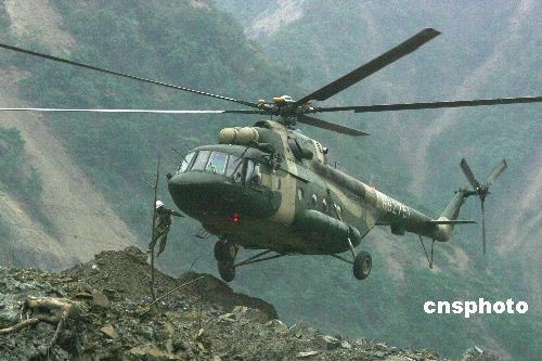 五月二十日是汶川大地震第九天,成都軍區(qū)陸航團姜廣偉王牌直升機組上午十時成功以單輪強降北川重災(zāi)區(qū)“定時炸彈”——堰塞湖無名塌方小土堆上,緊急運送水利地質(zhì)技術(shù)隊實地監(jiān)測水位上漲危情。一座大山的崩塌堵塞河道形成危險的堰塞湖,如果潰堤將危及北川全縣和綿陽災(zāi)區(qū)。中新社發(fā) 賈國榮 攝