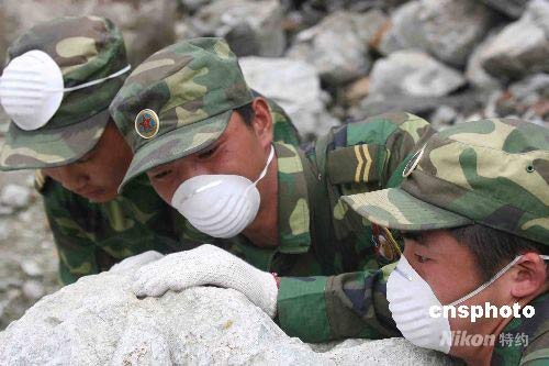5月21日,在震中汶川縣映秀鎮抗震救災的解放軍士兵胡志友路過家鄉時看到家的方向已是一片廢墟,胡志友卻沒有停下前進的腳步。他說:“我的任務在映秀鎮,漩口有我的戰友在,他們會幫助我的家人的!敝行律绨l 曾憲平 攝