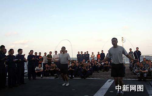 中新網“海口”艦1月10日電 當地時間1月10日下午,正在亞丁灣海域執行護航任務的“海口”號導彈驅逐艦繼續舉行甲板運動會,參賽官兵參加跳繩項目比賽。