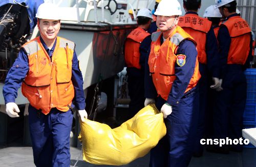 春節前夕,中國海軍艦艇編隊“海口”號導彈驅逐艦與“微山湖”號綜合補給艦完成一次海上補給,圖為“海口”艦官兵搬運補給到艦上的“年貨”。中新社發 孫自法 攝