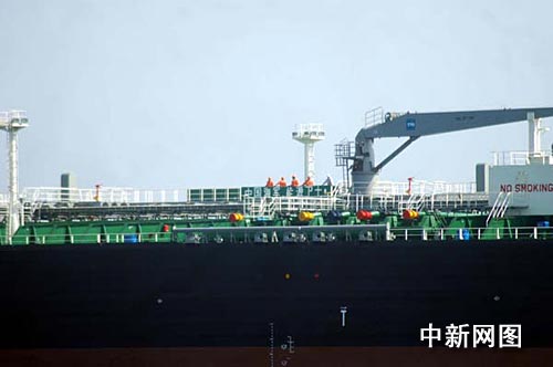 春節前夕,被護商船“凱達”號打出“中國海軍,能源衛士!”標語向護航官兵致敬。中新社記者 孫自法 攝