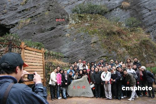 一月二十七日上午,兩岸三校師生在福建武夷山景區(qū)的大紅袍古老茶樹下合影留念。二十三日至二十七日,臺(tái)灣嘉義大學(xué)、臺(tái)灣屏東科技大學(xué)與福建農(nóng)林大學(xué)的四十位師生在此間開展茶文化之旅,探尋當(dāng)?shù)氐牟栉幕V行律绨l(fā) 周文杰 攝