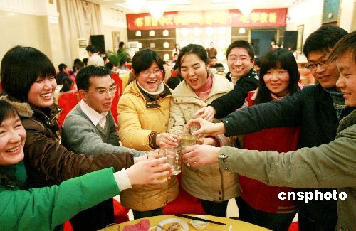 2月2日晚,江蘇蘇州高校百余名留守大學(xué)生齊聚東吳飯店,參加寒假“心愿六選一”(即,一張親情電話卡、一頓年夜飯、一次勤工儉學(xué)、一次英語培訓(xùn)、一次心理咨詢和一場免費電影)之年夜飯大聯(lián)歡活動。 中新社發(fā) 蘇秀 攝