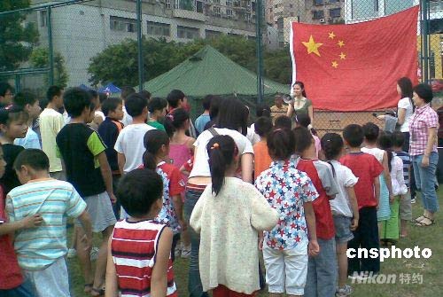 5月19日上午,在成都市青羊區體育中心安置點設置的“青羊區抗震救災愛心家園學校”開學。該校目前分小學、初中、高中三個班,共有80多名學生。圖為開學時舉行的升國旗儀式。中新社發 魏姝 攝