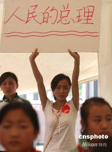 5月23日上午9時(shí)許,中國(guó)國(guó)務(wù)院總理溫家寶來(lái)到四川綿陽(yáng),到九洲帳篷學(xué)校看望地震災(zāi)區(qū)學(xué)生。在現(xiàn)場(chǎng)的一名青年教師雙手高舉“人民的總理”標(biāo)語(yǔ),表達(dá)對(duì)溫總理的愛戴和感激。中新社發(fā) 趙振清 攝