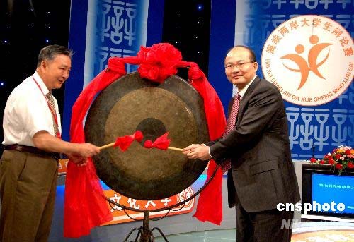 7月21日,福建省科學技術協會主席、中科院院士吳新濤(左)與臺灣中華青年交流協會理事長張昌吉為第七屆海峽兩岸大學生辯論賽開賽鳴鑼。當日,第七屆海峽兩岸大學生辯論賽在福州開賽,來自海峽兩岸共十六支高校代表隊參加角逐。中新社發 劉可耕 攝
