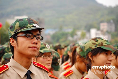 2008年9月3日,重慶西南大學育才學院3000多名新生走進軍營開始軍事訓練。作為第一批90后的大學生,他們進入大學后的第一堂課是體驗軍旅生活,鍛煉堅強意志。中新社發 許康平 攝
