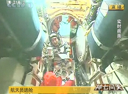 25日18時25分許,神舟七號三名航天員陸續進艙。第一名進艙的是景海鵬,第二名進艙的是劉伯明,最后,指令長翟志剛也開始進入。