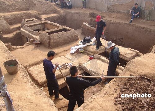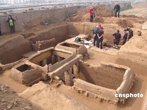 10月15日,考古人員正在挖掘漢墓。近日,在山東省沂南縣磚埠鎮發現占地約3000平方米的東漢家族墓葬群,經過上級部門批準,考古人員對其中兩座墓穴進行了搶救性科學挖掘,目前已經發掘出土8件釉陶壺在內的大量文物,墓內石壁上有多幅畫像,清晰可見。中新社發 杜昱葆 攝