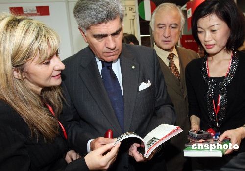 圖為意大利駐華大使謝颯(左二)親臨展館介紹意大利大學(xué)院校圖書。