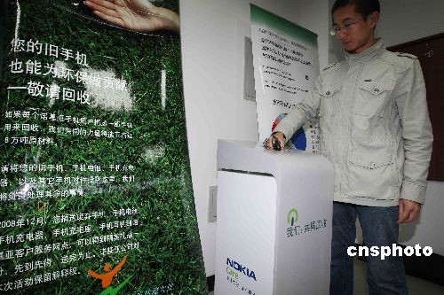 圖為大學生將手機等廢舊用品投入環保“綠箱子”。