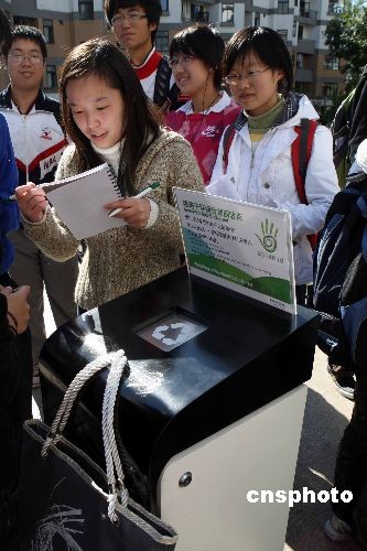 10月31日晚,由某環保企業率先發起的環保“綠箱子”進校園活動在中國傳媒大學、清華大學正式展開,此次活動的目的在于喚起全民族的環保意識,讓每一位公民都為環保事業做力所能及的事情。中新社發 任海霞 攝