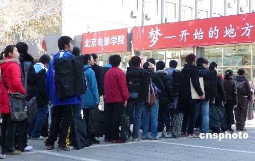 2009年2月7日,北京電影學院2009年招生初試工作已進入了第三天,一批批來自全國各地的考生繼續為圓明星夢而拼搏努力。今年最顯著的特點是本色考生越來越多,濃妝艷抹、奇裝異服的考生少了。據悉,表演專業一直被認為是北影“最難考的專業”,雖然今年的招生人數由往年的30人增加到75人,但面對4234名報考者,淘汰率仍高達98.2%。一位考官告訴記者,雖然報名者很多,但有充分準備、專業水平較高的考生不超過千人,還是有很多考生很盲目。中新社發 玉龍 攝