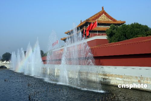 圖:北京天安門彩虹噴泉慶十七大勝利閉幕