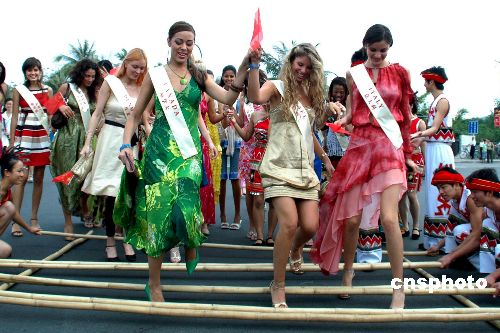 圖為佳麗們與海南黎族青年跳海南黎族傳統竹竿舞。