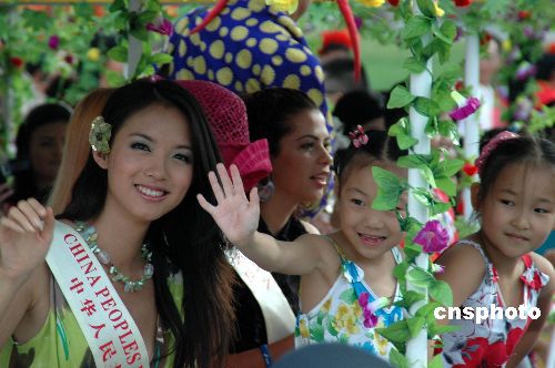 圖為中國小姐張梓琳與小朋友一起向觀眾揮手致意。