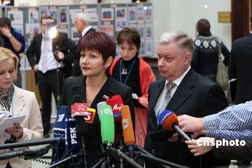 圖為俄中選委成員安娜·庫利亞索娃和俄聯邦移民局官員康斯坦丁·羅莫丹諾夫斯基,向媒體介紹國家杜馬選舉的進展情況。
